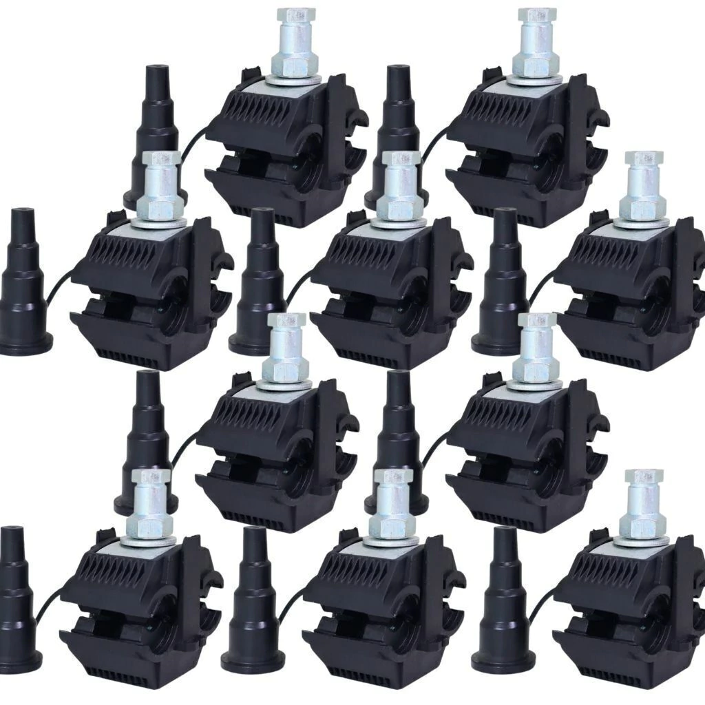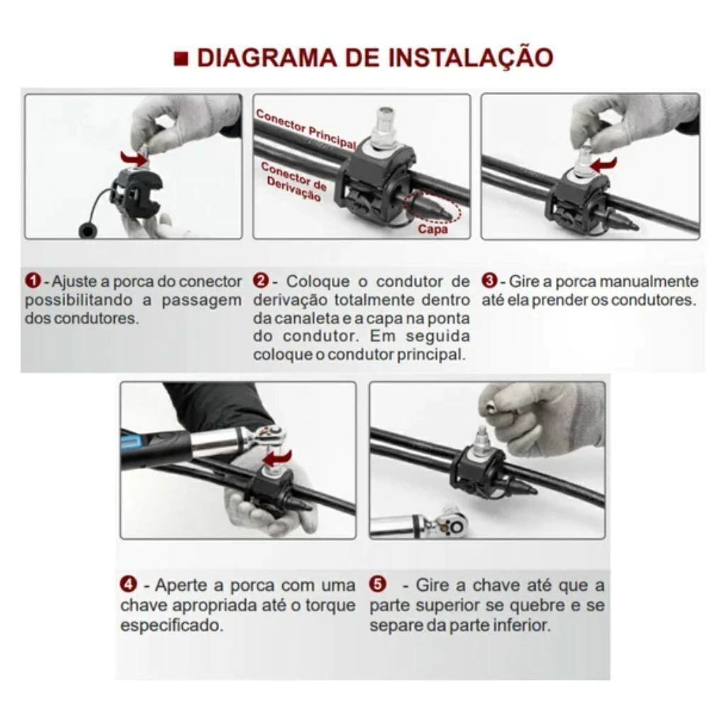 Instalação (resumo): posicionar no cabo principal e derivado, apertar até o torque recomendado pelo fabricante para perfuração/contato e vedação