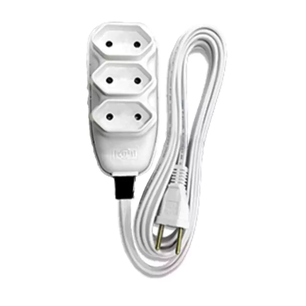Extensão elétrica, branca, 3 tomadas com 2 pinos e 5 m de comprimento.