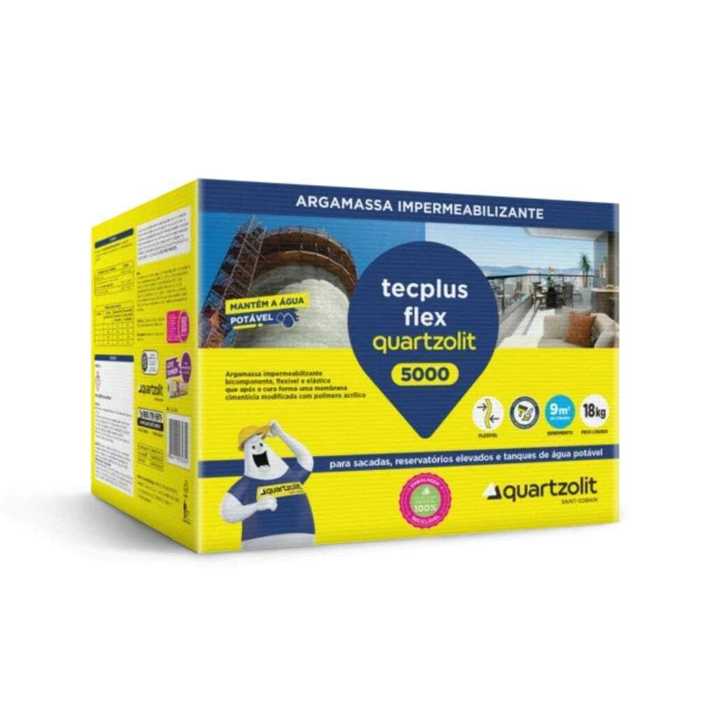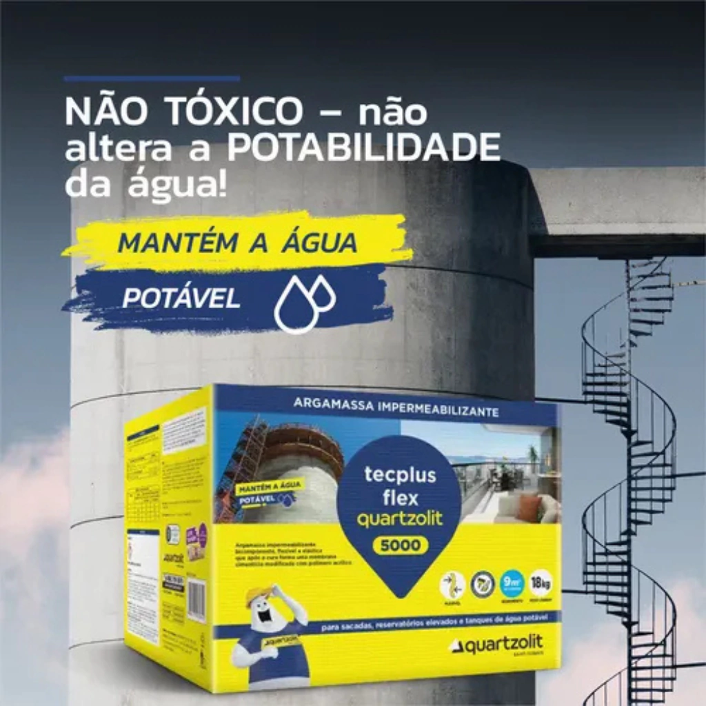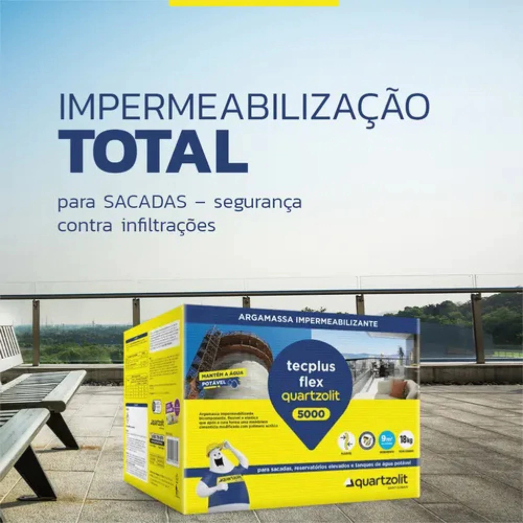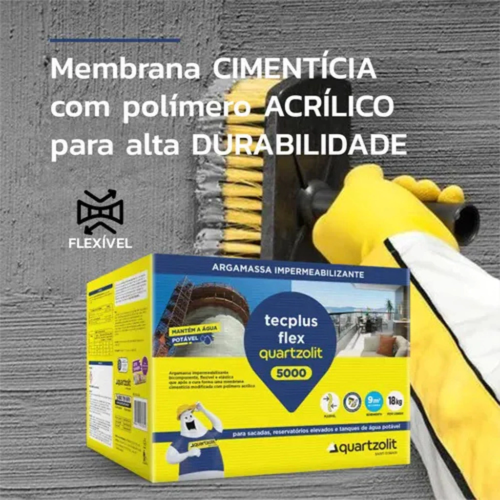 O Tecplus Flex 5000 Quartzolit (18 kg) é uma argamassa impermeabilizante bicomponente, altamente flexível e resistente, adequada para estruturas de concreto e alvenarias. Após a cura, forma uma membrana impermeável que acomoda fissuras, ideal para uso em lajes, terraços, pisos sobre solos, reservatórios, piscinas, varandas e áreas molhadas. Pode ser aplicado com brocha, trincha ou vassoura de pelo, e aceita acabamento com pintura ou revestimentos.
