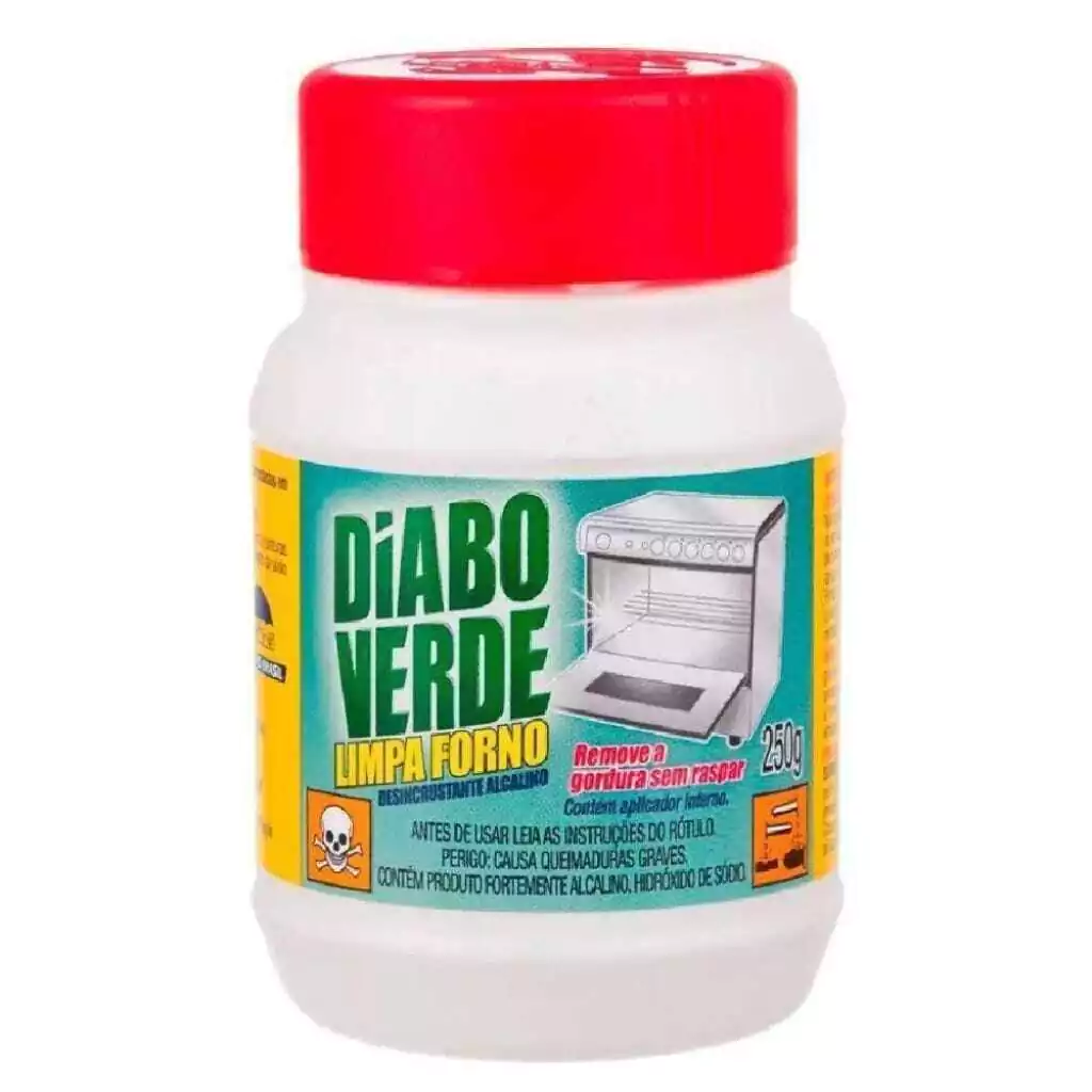 Diabo Verde Limpa Forno Desincrustante Alcalino Tradicional dissolve gorduras incrustadas em fornos, chapas e grelhas de ferro.