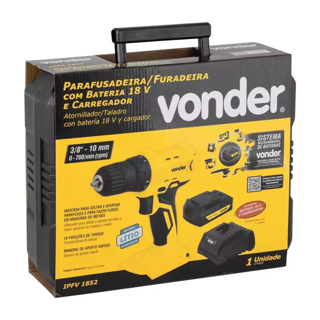 Este equipamento utiliza um modelo de bateria que pode ser intercambiável (acompanha), ou seja, uma bateria que é compatível com outros modelos de ferramentas a bateria VONDER. Por isso, em sua próxima compra de ferramenta a bateria VONDER, procure um modelo que comece com a referência "I", ou que esteja identificado com o selo "Bateria Intercambiável VONDER". Desta forma, você garante modelos mais econômicos, sem a necessidade de aquisição de novas baterias e carregadores para uso em seu equipamento. Leve, prática e portátil, possui regulagem de torque em 19 posições, adequando-se à necessidade de aperto de acordo com a dureza do material e 1 posição para perfuração, LED para melhor visibilidade do local de trabalho e cabo com revestimento emborrachado, proporcionando maior conforto ao operador. Conta também com mandril de aperto rápido, que facilita a troca rápida do acessório.