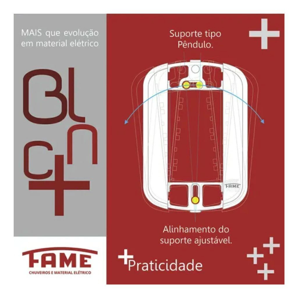 oferece acabamento moderno e discreto para instalações elétricas. O design sem parafusos aparentes valoriza o ambiente, enquanto o termoplástico de alto brilho com tratamento anti-UV mantém a cor branca por mais tempo. Compatível com módulos da linha Blanc+ (interruptores, tomadas etc.) e com suporte 4x4, proporciona montagem firme e prática em ambientes residenciais e comerciais.